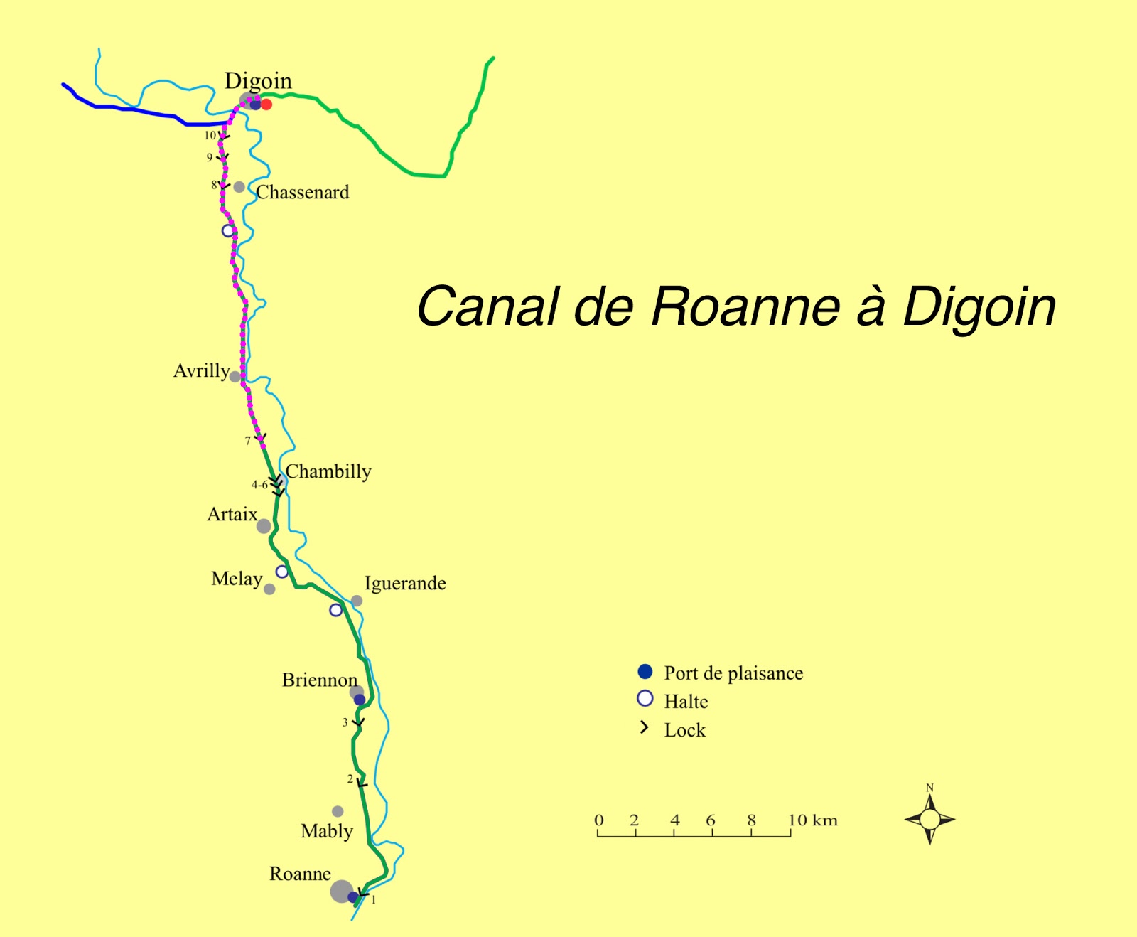 Von Digoin fahren wir auf dem Canal latéral à la Loire ein kurzes Stück zurück und biegen in den Canal de Roanne à Digoin ein. Der Kanal ist eine Sackgasse, er endet in Roanne – in ein paar Tagen werden wir dieselbe Strecke wieder zurück fahren. Roanne hat einen guten Ruf als Winterhafen; doch dieses Jahr wollen wir uns eine mögliche Winterdestination erst einmal ansehen, bevor wir uns festlegen.