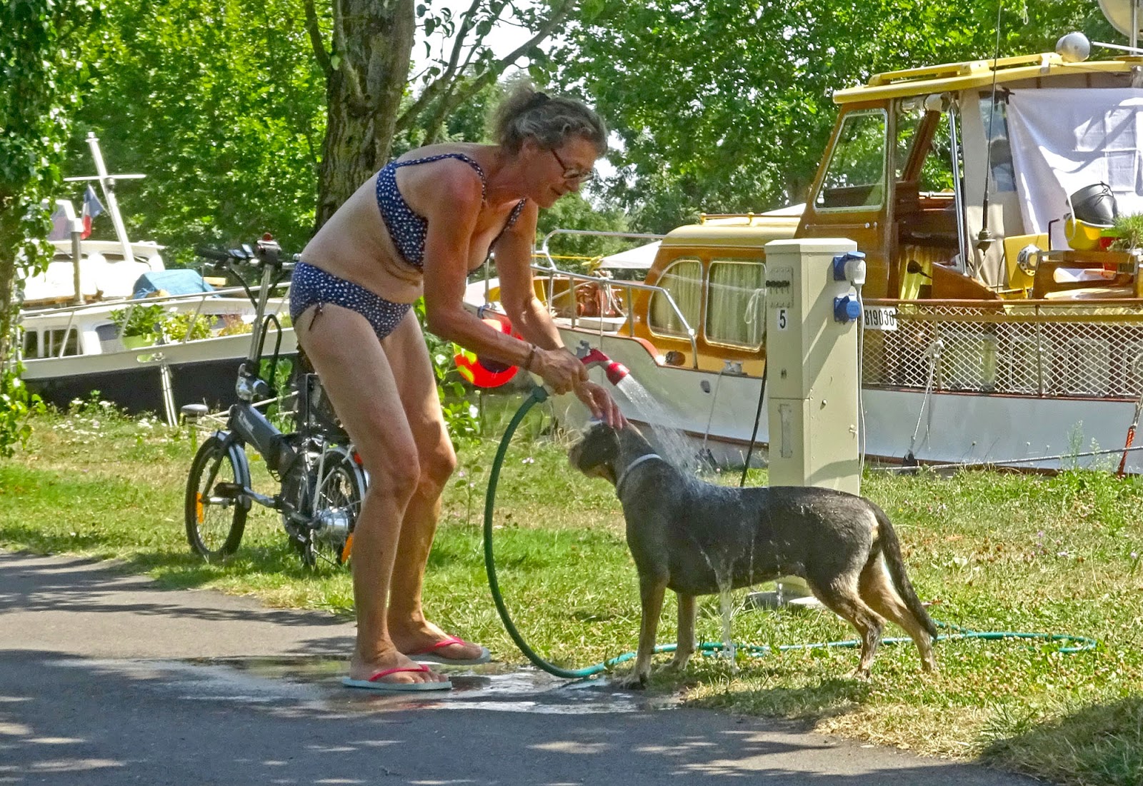 We chose a place at the start of the tree-lined portion of the quay. With the forecasts calling for nonstop temperatures of 30+ degrees, we're happy to be in such a green place, since most harbors offer no shade whatsoever....
